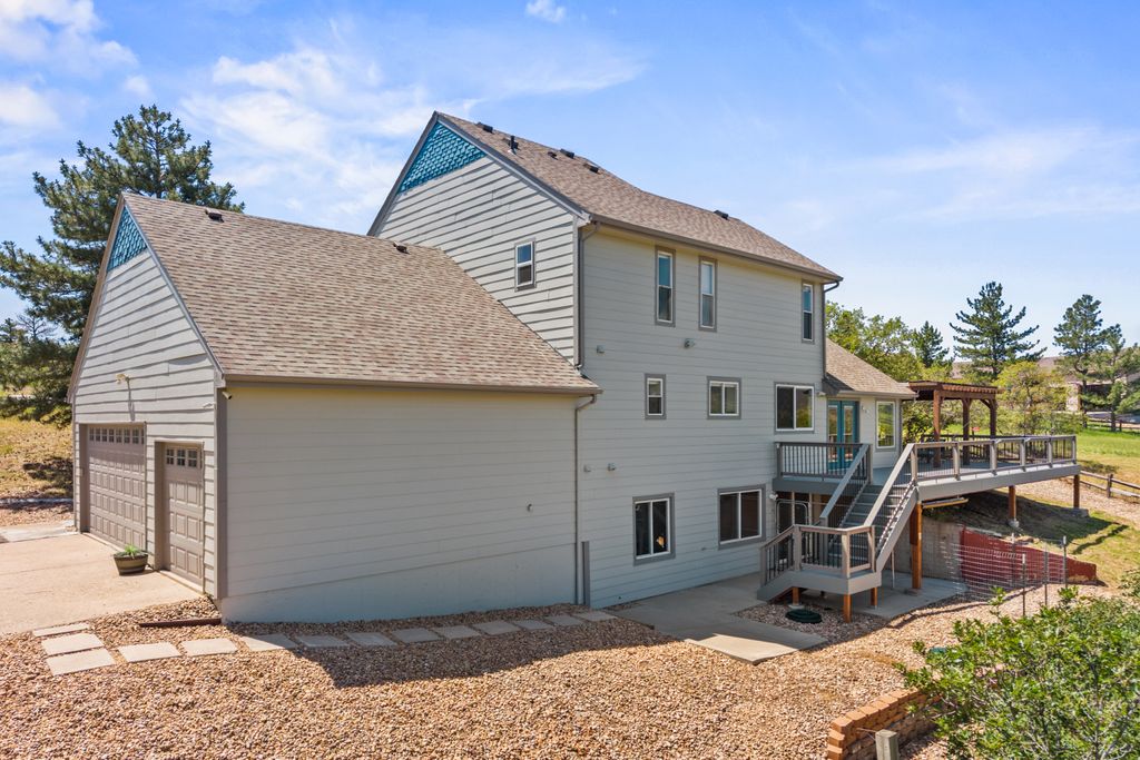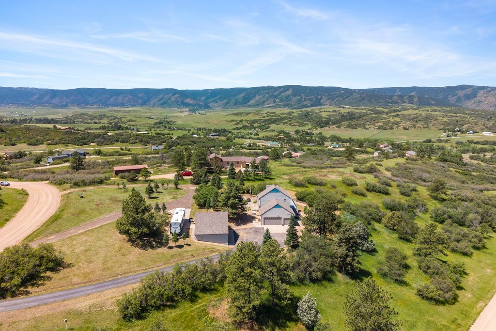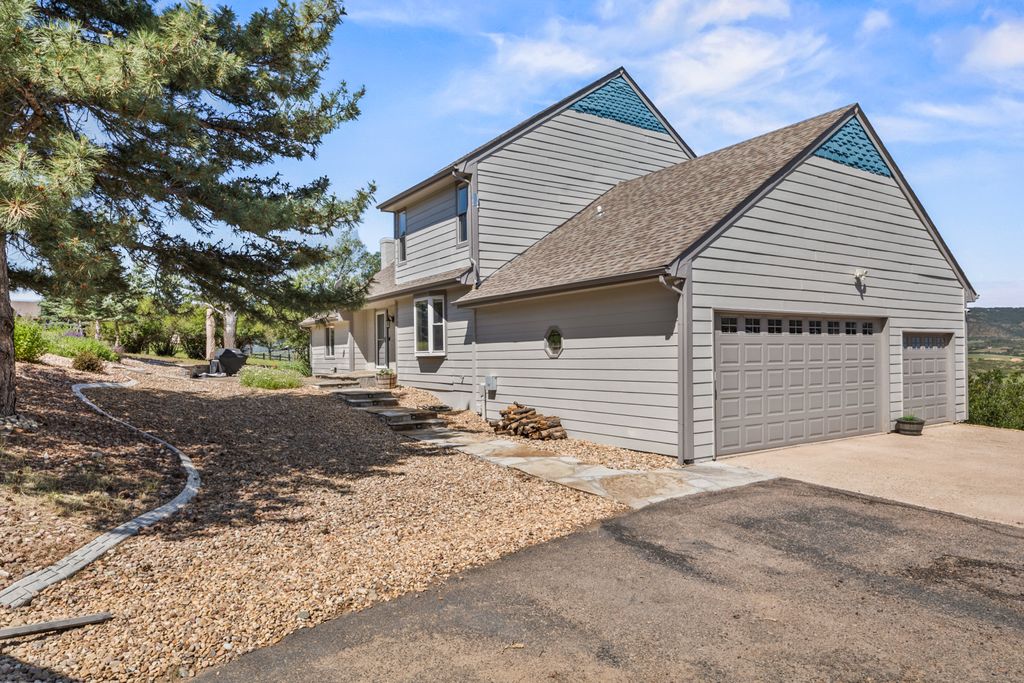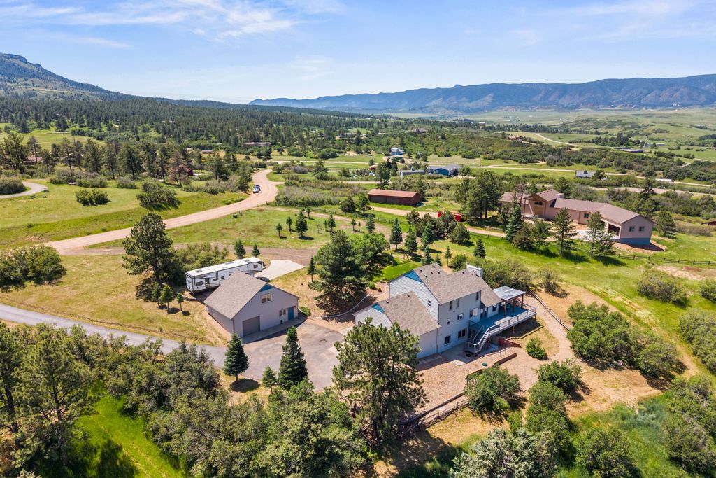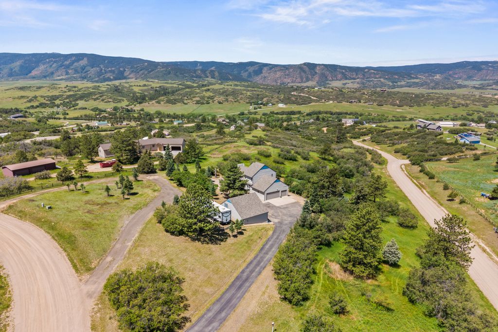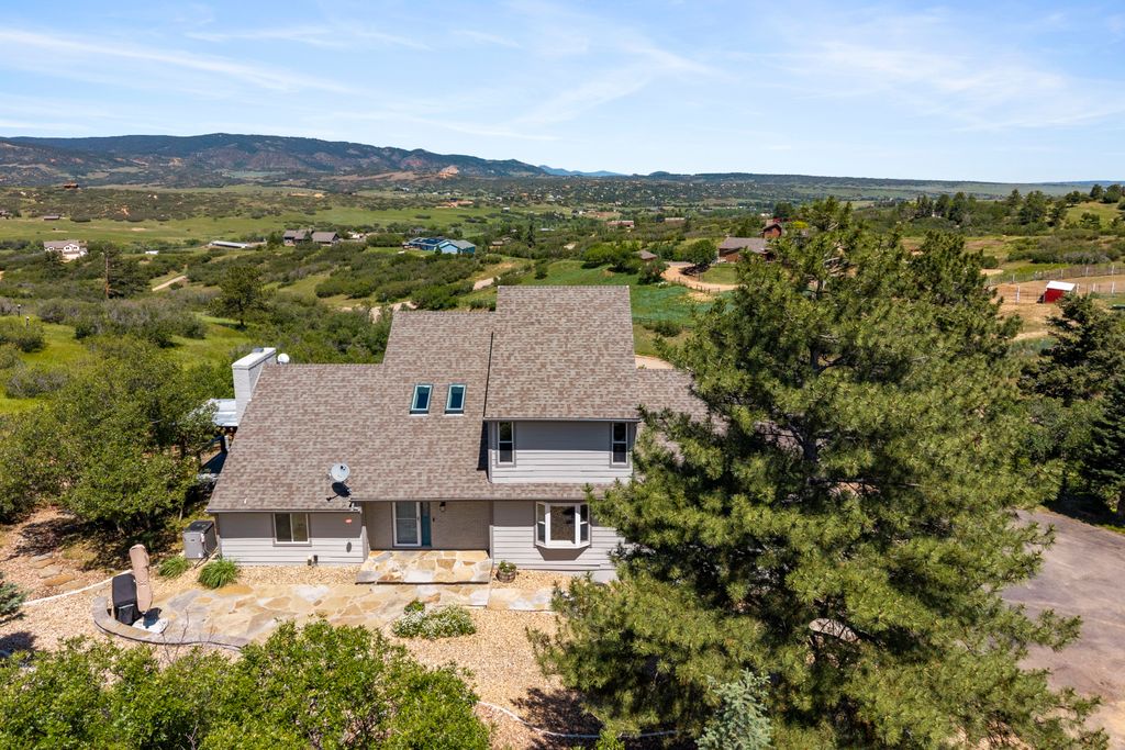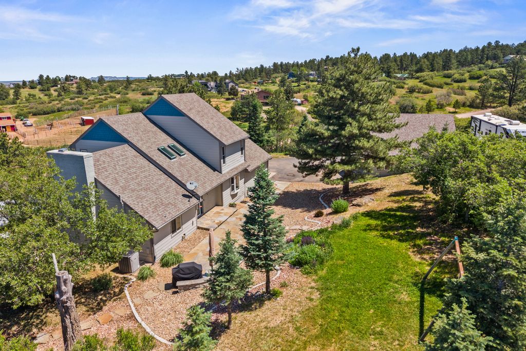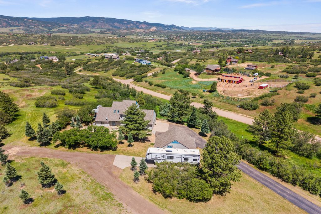 Imagine waking up to golden sunlight streaming through picture windows, the quiet rustle of trees, and the distant silhouette of the Rockies stretching across the horizon. You're not just buying a home—you're embracing a lifestyle of peace, space, and natural beauty, all on just under 5 acres of private, scenic land. This thoughtfully designed home invites you to slow down and savor every moment, whether you're enjoying a quiet morning on the deck or watching wildlife wander through the trees. The heart of the home is a chef’s kitchen, beautifully appointed with stainless steel appliances, granite countertops, and custom white cabinetry that extends to the ceiling with elegant crown molding. A large center island offers additional prep space and seating, while expansive counters make entertaining effortless. A built-in bench under a picture window creates the perfect nook for casual dining or morning coffee with a view. Warm wood floors flow throughout the main level, where a wood-burning fireplace anchors the cozy family room. The spacious mudroom includes custom built-ins, laundry, and a utility sink—ideal for Colorado’s four seasons. The vaulted primary suite is a true retreat, featuring a walk-in closet and a spa-like bath with dual marble vanity, heated tile floors, and a custom walk-in shower. A main-floor office and separate full bath offer flexibility for guests or multi-gen living. The finished walk-out basement includes a private bedroom, full bath, and a large flex space perfect for a gym, media room, or studio. Outside, enjoy a 3-car garage, a two-story workshop, and RV parking with a concrete pad. Zoning allows horses, with room to add a barn or outbuilding. All of this in the peaceful, picturesque community of Sedalia—where mountain views, open skies, and wildlife are part of everyday life.